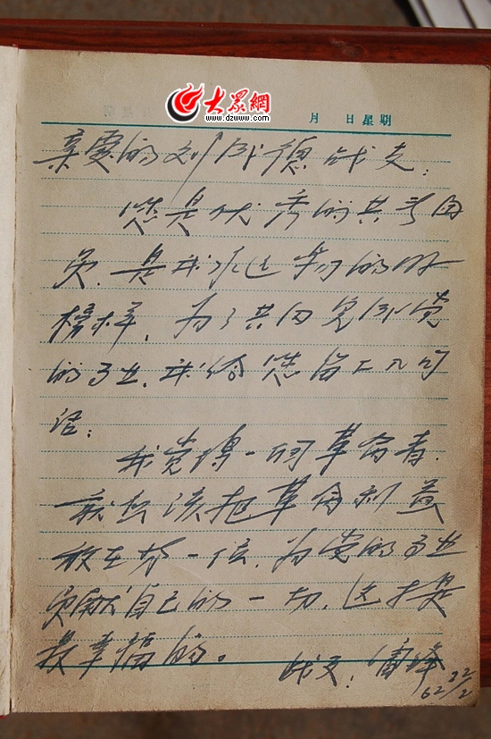 1962年2月,劉成德作為師部推薦的英模代表,參加了沈陽(yáng)軍區(qū)首屆共青團(tuán)員代表大會(huì)。會(huì)上,雷鋒與劉成德等代表在主席臺(tái)就座。雷鋒得知?jiǎng)⒊傻碌氖论E后,非常感動(dòng)。當(dāng)即給劉成德寫下:“您是優(yōu)秀的共青團(tuán)員,是我永遠(yuǎn)學(xué)習(xí)的好榜樣。為了共同完成黨的事業(yè),我給您留下幾句話:我覺(jué)得一個(gè)革命者,就應(yīng)該把革命利益放在第一位,為黨的事業(yè)貢獻(xiàn)自己的一切,這才是最幸福的!