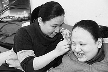 上中學(xué)后,劉國華的學(xué)業(yè)負擔(dān)日益加重,韓偉曾想把寶印送到康復(fù)中心!翱祻(fù)中心患者多,妹妹又不會說話,能過得好嗎?我辛苦點沒什么!彼齽裾f父母放棄了這個念頭。近20年里,除了在外上大學(xué),國華沒有一天離開過寶印。直到現(xiàn)在,33歲的姐姐還是一口口含著藥喂31歲的妹妹。喂上藥,再用小勺喂水,然后擦干凈嘴角!爸兴幒芸,用小勺喂,寶印不吃,還會打翻勺子,只有一口口地喂,她才肯吃一些!2009年,寶印被查出患上糖尿病,國華每天要給寶印打三次針。在一次打針時,國華發(fā)現(xiàn)針管中有血。為了不讓寶印受苦,劉國華竟在自己身上試針,掌握好力度、找準(zhǔn)位置后,才敢給給妹妹下針。