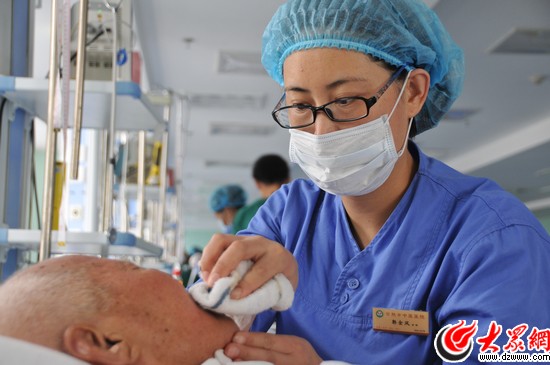 大眾網濟南9月16日訊(記者 于瀟瀟)ICU又稱重癥監(jiān)護室,這里集中了醫(yī)院里病情最重、最危急的病人,需要時刻有人看護。在日照市中醫(yī)醫(yī)院腦病三科重癥監(jiān)護室(ICU)里,護士郭金鳳已經工作了8年多,把自己的青春獻給了ICU這一特殊的護理崗位。