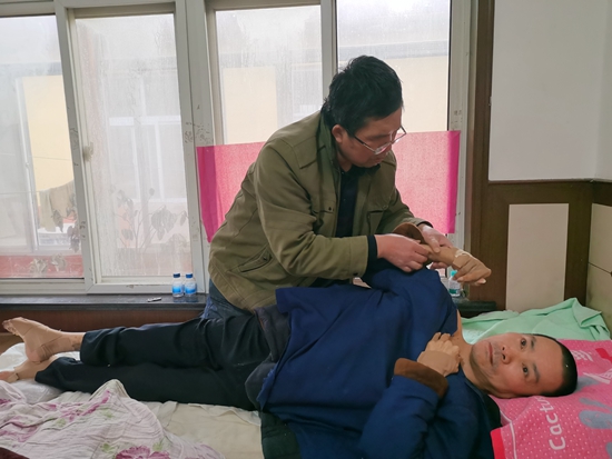 因?yàn)閺?qiáng)直性脊柱炎加類風(fēng)濕,弟弟馬業(yè)芹全身除左手外都無法動(dòng)彈。上藥時(shí),馬永芹需要將全身僵硬的弟弟翻過來側(cè)身躺著,自己趴在弟弟身后一點(diǎn)一點(diǎn)地涂抹。86歲的老母親楊淑珍在一旁倚著炕頭坐著,因?yàn)槟挲g太大,身體衰老的她已經(jīng)幫不上什么忙了。楊淑珍一共有四個(gè)兒子,馬永芹排行老大,癱瘓的馬業(yè)芹是老三,二兒子和四兒子常年在外,在自己跟前伺候的只有老大馬永芹,“我們這個(gè)家真的是多虧了老大!崩咸f著就哽咽了。弟弟馬業(yè)芹今年53歲,從13歲那年就一直癱瘓?jiān)诖,一日三餐,大小便都需要人照顧?/p>