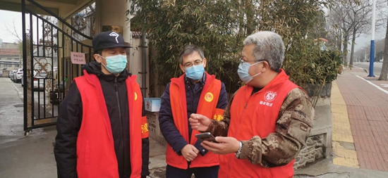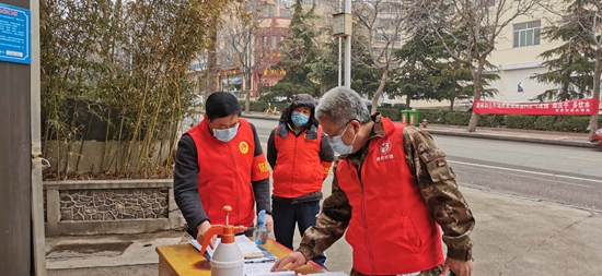劉玉考所居住的金山社區(qū)面積不足1平方公里,有居民小區(qū)42個(gè),2324戶,6808人,居住人口密度較大、社區(qū)工作人員少且以女性為主。疫情發(fā)生后,社區(qū)全部工作人員都投入到了抗擊疫情的戰(zhàn)斗中,工作力量卻仍然捉襟見肘。社區(qū)防控力量薄弱、防控壓力大的問題,劉玉考看在眼里,急在心里。“我是一名共產(chǎn)黨員。面對(duì)疫情,我理應(yīng)沖鋒在前,為打贏疫情防控阻擊戰(zhàn)做出黨員應(yīng)有的示范帶頭作用!贝竽瓿醵,他就毫不猶豫地報(bào)名加入了社區(qū)抗疫志愿者的隊(duì)伍,以一名老黨員的身份成為了沖鋒在社區(qū)抗疫一線的“戰(zhàn)士”。疫情中的泰城格外的寒冷,但他卻從未間斷志愿服務(wù)工作,而且一干就是20多天。他每天都堅(jiān)持守護(hù)在社區(qū)防控點(diǎn)開展一線防控工作,對(duì)進(jìn)出小區(qū)的居民測(cè)量體溫、辦理出入登記,并在各小區(qū)輪流進(jìn)行巡查,積極調(diào)查疫情防控的薄弱環(huán)節(jié)。在日常的志愿巡查中,他發(fā)現(xiàn)多處被居民破壞的封路圍擋,及時(shí)向社區(qū)報(bào)告,幫助社區(qū)防疫工作“找漏洞,補(bǔ)短板”。