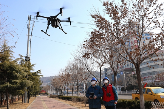 耿博操作無(wú)人機(jī)對(duì)重要客戶供電線路進(jìn)行巡視(左一)