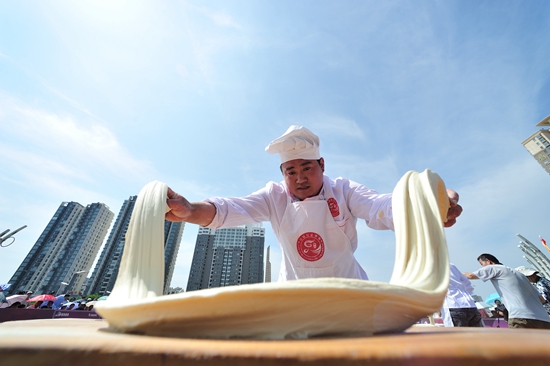 姜常論在展示煙臺市非物質(zhì)文化遺產(chǎn)——郭城摔面的制作過程