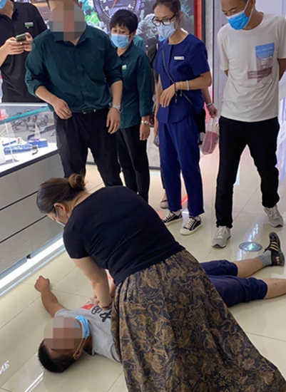 2020年9月7日,沈曉玉在淄博市信譽(yù)樓商場購物,準(zhǔn)備下樓梯往回走時(shí),剛到二樓電梯口,突然聽到“啊”的一聲,隨即看到一名年輕男子,躺在地上,手腳抽搐,職業(yè)的敏感使她意識(shí)到男子肯定突發(fā)某種疾病,非常危險(xiǎn)。她立即跑過去查看,同時(shí)向周圍的人群表明自己醫(yī)務(wù)人員的身份,讓大家不要靠得太近,給患者留出足夠的空間,確?諝饬魍ā4藭r(shí)躺在地上的男子已停止抽搐,沒有了意識(shí),拍打身體也無反應(yīng),她趕緊觸摸男子的頸動(dòng)脈,已沒有了搏動(dòng)。沈曉玉心里“咯噔”一下,“不好,需要立即搶救!”時(shí)間就是生命,她迅速為患者清理口鼻腔分泌物,立刻開放氣道為其實(shí)施心肺復(fù)蘇,并讓圍觀群眾抓緊時(shí)間撥打120 。經(jīng)過兩分多鐘的緊張搶救,硬生生將該男子從死亡線拉了回來,男子心臟終于又開始搏動(dòng)并有了自主呼吸!