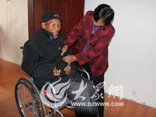 由于公公手變形不能動,腳不能走路,都是兒媳婦一手拿飯,一手端湯,一口飯一口湯地喂,一頓飯得一個小時。兒媳李中朵說:“俺爹年齡大了,在床上不能動彈消化不好,俺就盡量給他做合適的吃,還買了豆?jié){機,天天早上給燒杯熱豆?jié){喝。只要天好,就把老人抱到門口曬曬太陽,夏天,天天擦身洗澡!