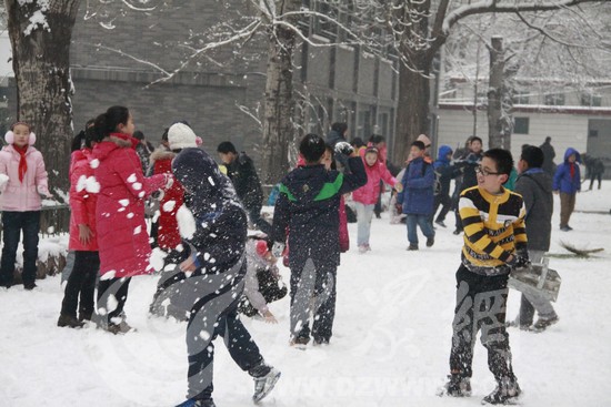 山東大學(xué)第二附屬小學(xué)的孩子們一大早就來到學(xué)校,與同學(xué)們打雪仗。記者 張帆 攝