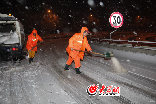 在濟(jì)南市區(qū)高架橋上,環(huán)衛(wèi)工們正在撒融雪劑。