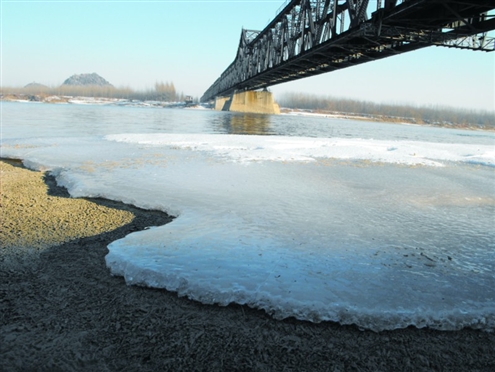 昨日,在黃河濟(jì)南濼口段,河岸淺水地帶開始結(jié)上厚厚的冰,并且河中出現(xiàn)“冰坨”現(xiàn)象 記者鄭濤攝