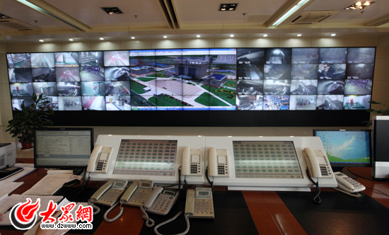 安全生產(chǎn)指揮中心內(nèi)巨大的顯示屏可以監(jiān)視井下及廠區(qū)內(nèi)各處的情況。(盛堃 攝影)