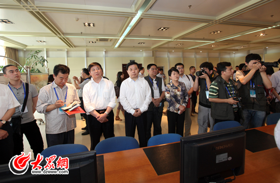 領(lǐng)導和采訪團記者在山東新巨龍能源有限責任公司的安全生產(chǎn)指揮中心內(nèi)參觀采訪。(盛堃 攝影)