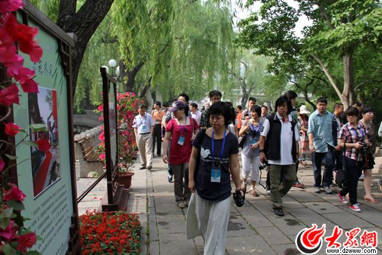 采訪團參觀趵突泉及濟南市文化建設(shè)展板。(馬鑫 攝)