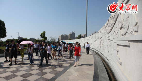 采訪團(tuán)記者參觀采訪東湖公園內(nèi)的文化墻。(盛堃 攝影)
