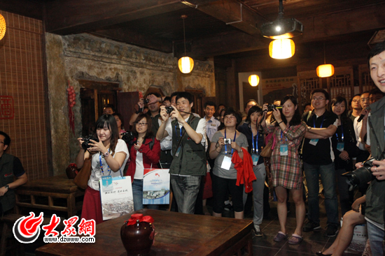 臺(tái)兒莊古城內(nèi)的酒文化展館引起記者們的興趣。(盛堃 攝影)
