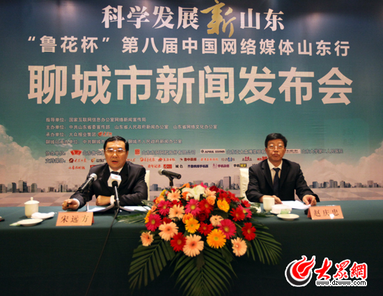 聊城市委書記、市人大常委會(huì)主任宋遠(yuǎn)方出席科學(xué)發(fā)展新山東——“魯花杯”第八屆中國(guó)網(wǎng)絡(luò)媒體山東行聊城市新聞發(fā)布會(huì)。(盛堃 攝影)