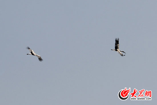 幾只國家一級保護鳥類東方白鸛時不時的盤旋在采訪團上空。(馬鑫 攝)
