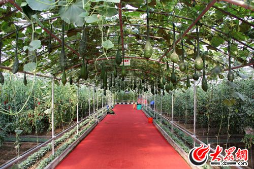 無(wú)“土”生金、獨(dú)“樹”成林、萬(wàn)“果”同根,一走進(jìn)展示大廳,眾多的蔬菜藝術(shù)品立刻讓人眼花繚亂。一棵棵綠油油的蔬菜整齊地“長(zhǎng)”在管道、廊架上和展示池中,按比例配好的營(yíng)養(yǎng)物質(zhì)放進(jìn)水里便融化成營(yíng)養(yǎng)液,管道則把這些營(yíng)養(yǎng)液輸送給植物根系,只需要給它點(diǎn)陽(yáng)光。據(jù)了解,由于蔬菜在土壤中連年種植后,積累的鹽分和根結(jié)線蟲等病蟲害對(duì)作物根系的危害很大,而無(wú)土栽培便有效地解決了重茬問(wèn)題。像這種“水培”模式不僅不會(huì)污染環(huán)境,而且使單位面積的產(chǎn)量至少提高5倍,由于營(yíng)養(yǎng)直接充足供給,葉菜植物的生長(zhǎng)期比在土壤里更短。