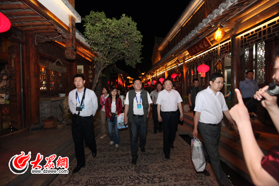 領(lǐng)導(dǎo)及采訪團(tuán)記者一同夜游臺(tái)兒莊古城。(盛堃 攝影)