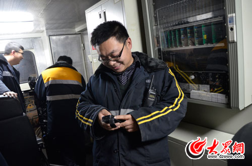 此時,搗固車副車長魏汝坤下車查看維修情況。由于正車長回家結(jié)婚,因此,他在行使正車長的職能。小魏20歲司機學(xué)校畢業(yè),一干就是8年,看著我們凍得直跺腳,他把我們拉到車上工作間笑著告訴我們:“今天最冷才零下6度,不太冷,施工點離車站只有一公里,這是我們最幸福的一夜了。前幾天在青島野外,零下十多度,臉都凍僵了……”