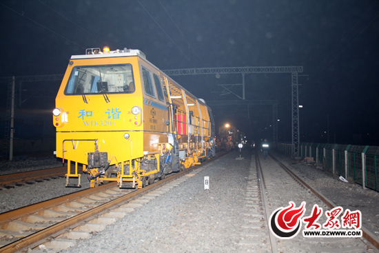 朱德泉 馬鑫 來源: 大眾網(wǎng)[提要] 1月13日晚上8點28分,淄博市臨淄火車站前,漆黑、安靜。大眾網(wǎng)記者跟隨濟南鐵路局工務(wù)機械段的20多名維修工走上月臺。此時,鐵軌上,一組50多米長的維修機車正靜臥在膠濟鐵路客運專線上,等待我們的到來。