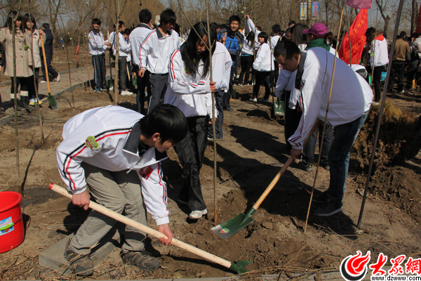 “開工嘍!”上午10點,在一片歡呼聲中,1萬多名愛心企業(yè)員工、學(xué)生和網(wǎng)友們,肩扛鐵鍬、手拎水桶開始了植樹活動!皝恚惴鲋鴺,我來挖土吧”網(wǎng)友李先生對只有12歲的兒子說,小家伙雖然沒有鐵鍬高,仍然堅持要自己挖土,“這樣種下的樹才屬于我的!” 在植樹現(xiàn)場,記者注意到,很多網(wǎng)友每種下一棵樹都會在樹杈上掛上一張“心”型許愿卡,“再過幾個月我們就要各奔東西了,希望這棵樹能載著我們的友誼茁壯成長”來自山東英才學(xué)院的大學(xué)生張曉說。中午12點,根據(jù)安排,植樹活動本應(yīng)結(jié)束,但是不少網(wǎng)友仍不顧疲憊還要多種一棵樹,濟(jì)南市民孫先生是自己開車帶著老婆、兒子過來的,“我們一共種了八棵樹”,孫先生說,這次參加植樹活動他們做足了準(zhǔn)備,還帶了午飯,“權(quán)當(dāng)是野外聚餐了”,吃完午飯,他們準(zhǔn)備把八棵樹苗再挨個澆一遍水。據(jù)統(tǒng)計,截止下午1點,1萬名網(wǎng)友共同種下了玉蘭、柳樹等共計2萬多株。