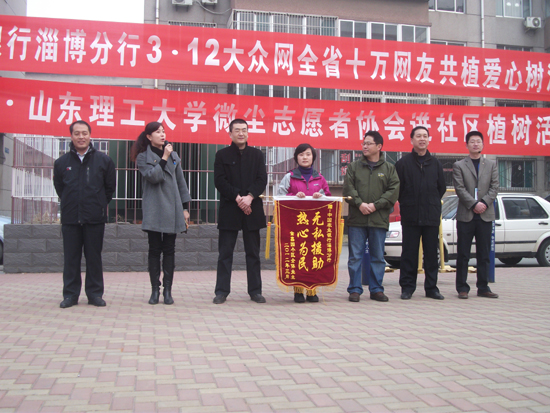 大眾網(wǎng)淄博3月11日訊(通訊員 解偉) 正值第34個植樹節(jié)到來之際,為響應(yīng)黨中央“學(xué)習(xí)雷鋒精神” 的號召,體現(xiàn)當(dāng)代大學(xué)生的志愿服務(wù)精神,3月10日上午,建筑工程學(xué)院微塵志愿者協(xié)會與中國農(nóng)業(yè)銀行淄博分行以及鑫馬物業(yè)管理有限公司合作進行的植樹活動在張店區(qū)金鑫園小區(qū)順利開展。山東理工大學(xué)團委副書記劉興清、建筑工程學(xué)院黨總支副書記田兆富、團總支書記張樹霞、輔導(dǎo)員張燕麗,中國農(nóng)業(yè)銀行淄博分行主任陳鵬、經(jīng)理初敏,淄博鑫馬房地產(chǎn)開發(fā)有限公司總經(jīng)理張鵬、副總經(jīng)理劉維明、鑫馬物業(yè)管理有限公司總經(jīng)理李向東,馬尚鎮(zhèn)黨委委員、宣傳部部長谷瑤,及50余名微塵志愿者參加了此次活動。