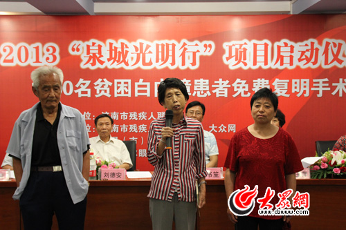 為幫助濟(jì)南市貧困白內(nèi)障患者重見光明,濟(jì)南市殘疾人福利基金會早在2010年便啟動首期“泉城光明行”活動,為濟(jì)南市200名白內(nèi)障患者實施了免費手術(shù)。2011年,第二期活動將救助名額增至500人。截止2012年底,“泉城光明行”活動已成功開展了三期,累計幫助1000多名貧困白內(nèi)障患者免費實施了復(fù)明手術(shù)。為了讓更多的貧困白內(nèi)障患者從中受益,第四期“泉城光明行”項目免費手術(shù)名額定為1000人。