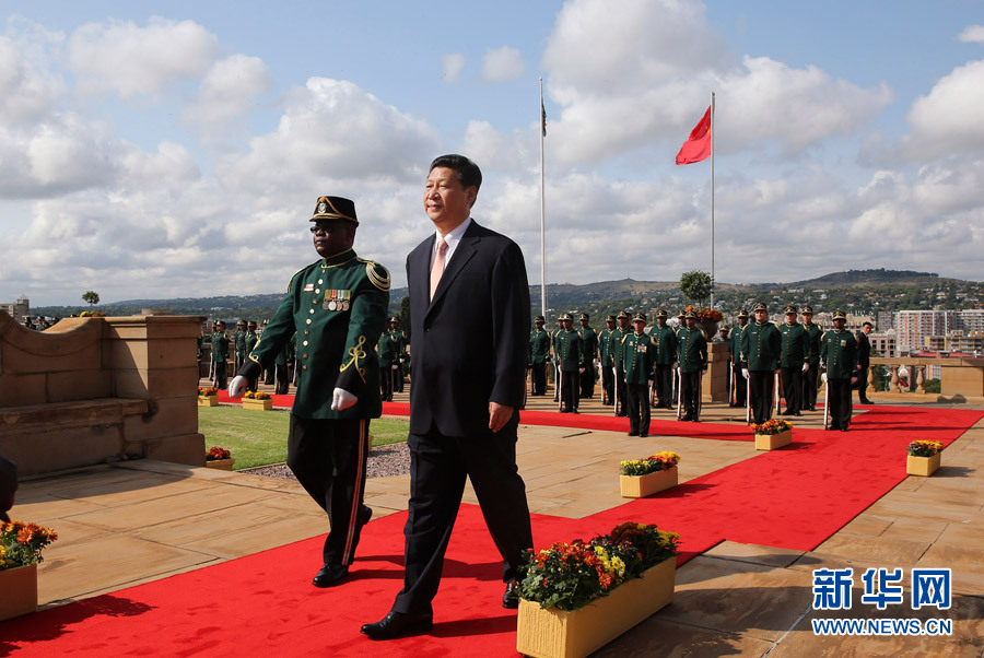 3月26日,南非總統(tǒng)祖馬在比勒陀利亞聯(lián)邦大廈前廣場舉行儀式,歡迎中國國家主席習(xí)近平訪問南非。這是習(xí)近平檢閱儀仗隊。 新華社記者 蘭紅光攝