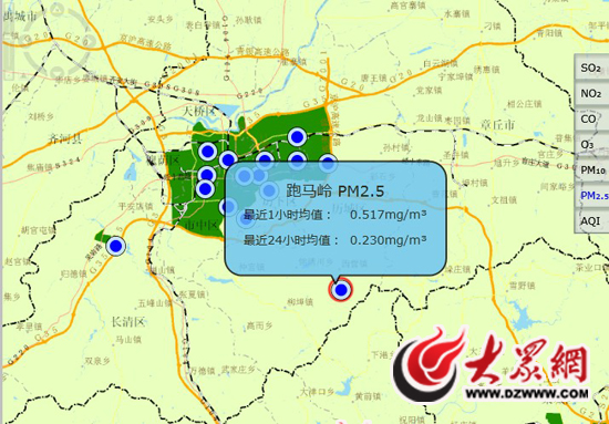 此外,根據(jù)統(tǒng)計,除了市監(jiān)測站、科干所、開發(fā)區(qū)3個監(jiān)測點周圍的首要污染物為可吸入顆粒物PM10以外,全市其他12個監(jiān)測點統(tǒng)計的首要污染物均為PM2.5。其中,被稱作濟南“后花園”的跑馬嶺監(jiān)測站最近1小時檢測到的PM2.5均值最高,為0.517mg/m?,超出國標6.9倍。泉城廣場、長清區(qū)委黨校監(jiān)測到的最近1小時均值超標也達到4倍。