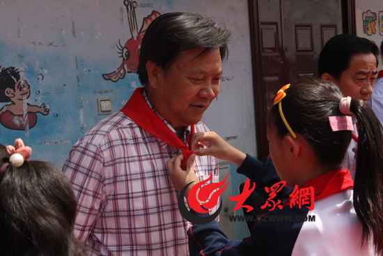 東平縣戴廟鎮(zhèn)中心小學(xué)的小學(xué)生為省人大辦公廳副主任高月塘系紅領(lǐng)巾。