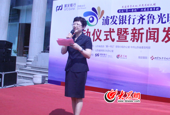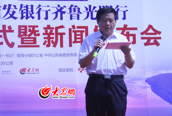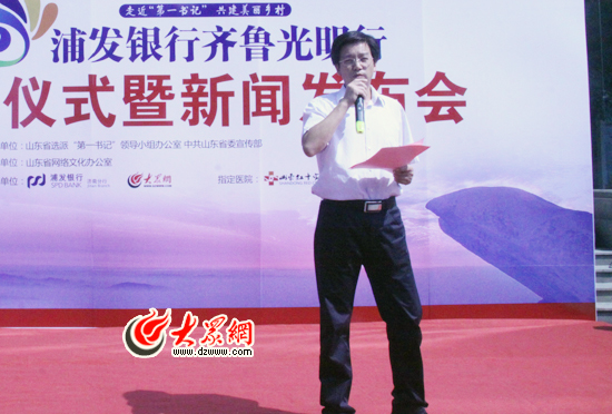 在啟動(dòng)儀式上,山東大眾傳媒股份有限公司(大眾網(wǎng))董事長、總經(jīng)理林忠禮介紹了本次活動(dòng)的相關(guān)情況。他說,多年來,大眾網(wǎng)在打造輿論主陣地、弘揚(yáng)時(shí)代主旋律的同時(shí),大力開展網(wǎng)絡(luò)文化惠民實(shí)踐活動(dòng),“走近‘第一書記’·共建美麗鄉(xiāng)村”將以其新聞性、公益性、貼近性、廣泛性助推文化惠民,也必將促進(jìn)全省網(wǎng)絡(luò)文化事業(yè)的發(fā)展。在本次“浦發(fā)銀行齊魯光明行”活動(dòng)中,大眾網(wǎng)將充分利用新媒體宣傳優(yōu)勢,與愛心企業(yè)、志愿者們一道,將愛和責(zé)任的種子撒播齊魯大地。