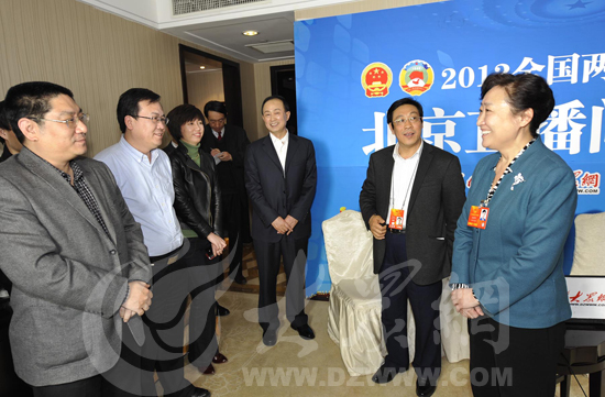 大眾網(wǎng)總編輯朱德泉向翟魯寧介紹大眾網(wǎng)2013全國兩會專題。(特派記者 盛堃 攝)