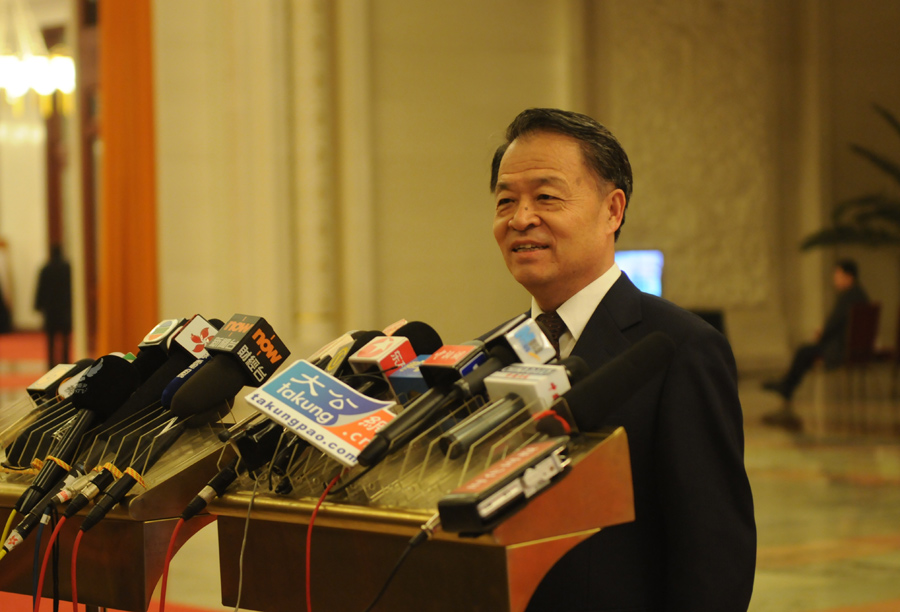 3月15日(星期五)上午9時(shí),十二屆全國(guó)人大一次會(huì)議在人民大會(huì)堂舉行第五次全體會(huì)議,決定國(guó)務(wù)院總理的人選;決定中華人民共和國(guó)中央軍事委員會(huì)副主席、委員的人選;選舉最高人民法院院長(zhǎng);選舉最高人民檢察院檢察長(zhǎng)。圖為交通運(yùn)輸部部長(zhǎng)楊傳堂接受記者群訪。翟子赫 攝