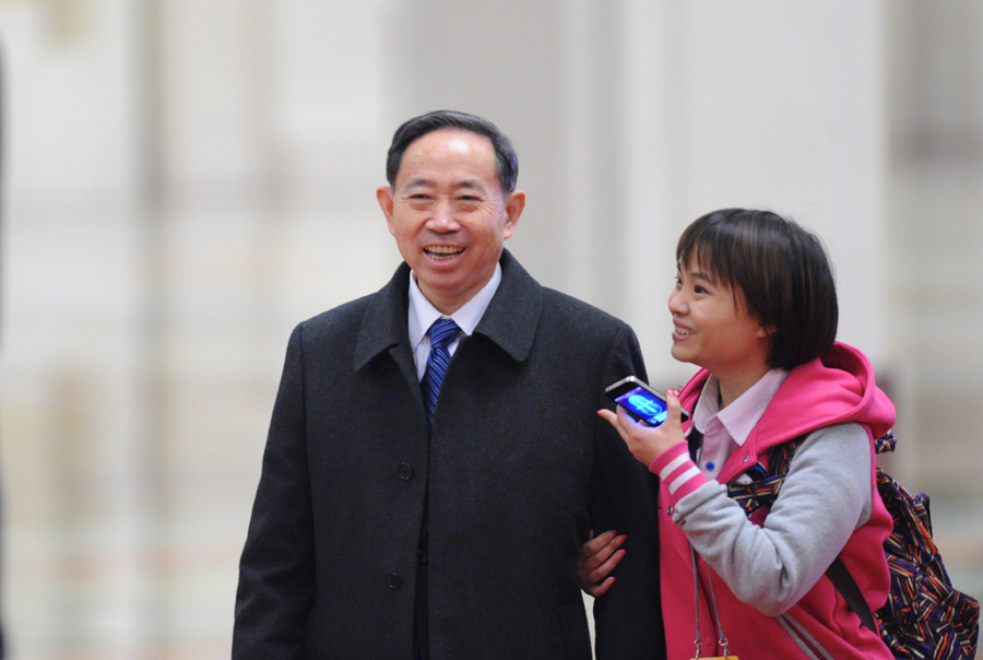3月15日上午9時,十二屆全國人大一次會議在人民大會堂舉行第五次全體會議,決定國務(wù)院總理的人選;決定中華人民共和國中央軍事委員會副主席、委員的人選;選舉最高人民法院院長;選舉最高人民檢察院檢察長。圖為大會開幕前教育部部長袁貴仁在記者的“追纏”下步入會場。 新華網(wǎng)/中國政府網(wǎng) 陳競超 攝