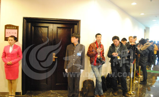 3月4日下午2點,全國政協(xié)委員莫言所在的文藝界別26小組會議室外,記者們提前一小時排隊等候入場。(大眾網(wǎng)特派記者王磊 攝)
