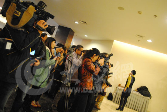 在會議室外,還有一大批記者把鏡頭對準電梯口,時刻準備著莫言出現(xiàn)。(大眾網(wǎng)特派記者王磊 攝)