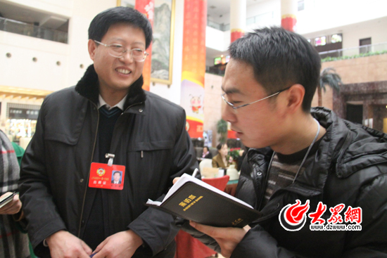 山東省十一屆政協(xié)一次會(huì)議委員史文憲在報(bào)到現(xiàn)場接受大眾網(wǎng)記者采訪。