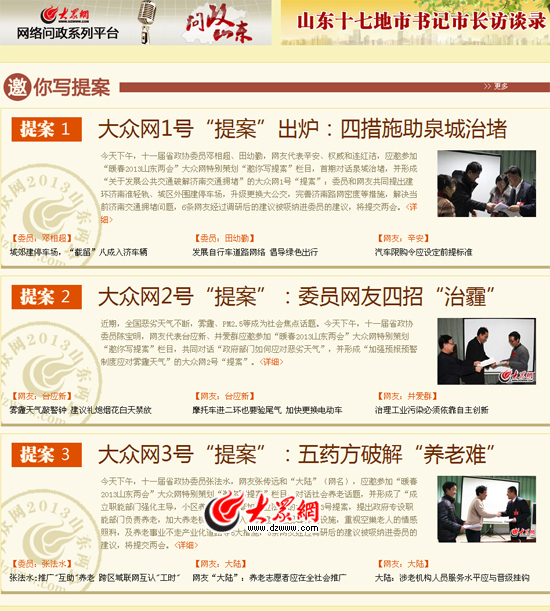 2013年省“兩會”,大眾網(wǎng)特別策劃推出網(wǎng)友互動欄目——“邀你寫提案”。