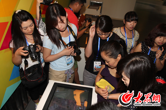 除了靜態(tài)的圖板展示,濱州城市規(guī)劃展示館內(nèi)還通過三維數(shù)字沙盤、4D虛擬駕駛城市漫游、電子翻書、動感踩吧等多種高科技設(shè)備展示濱州形象,而這些設(shè)備也格外受到采訪團(tuán)成員們的歡迎。