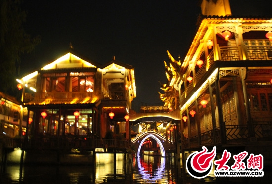 白天的臺兒莊古城清美寧靜,青石板路,亭臺樓閣,清水在路邊盈盈流淌,游人在這里放下心事盡情賞景。古城似有南方小鎮(zhèn)的婉轉清秀,又流露出北方水土的豪邁風情。采訪團的記者們來到此地后倍感驚訝:“北方竟也有這般富含風韻的古城?”