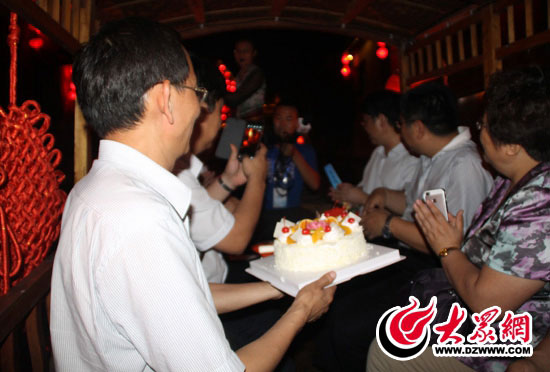 大眾網(wǎng)棗莊6月21日訊(記者 郭豪 赫洋 呂斌)“Happy birthday to you,Happy birthday to you……”今天晚上,“聚焦美麗山東—中國網(wǎng)絡媒體山東行”西線采訪團在臺兒莊古城登船夜游采訪,6位在本月生日的采訪團成員驚喜地獲得了會務組精心準備的奶油蛋糕,在游船上在夜色里,大家共同度過一個歡樂、愜意的夜晚。