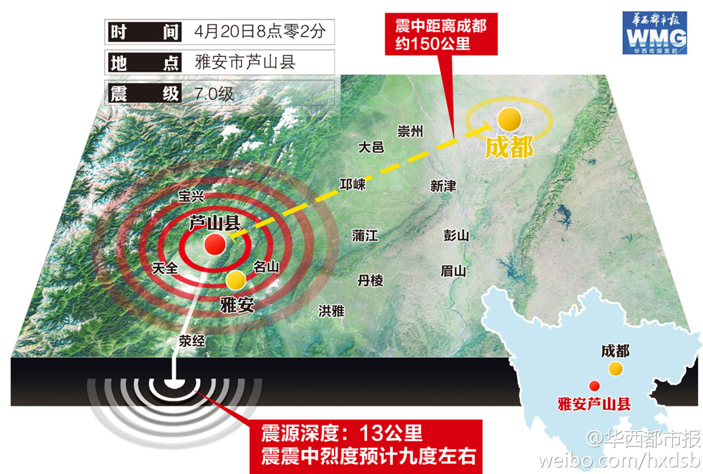 據(jù)中國地震臺網(wǎng)測定,北京時間2013年4月20日8時2分,在四川省雅安市蘆山縣發(fā)生7.0級地震, 震源深度13公里。