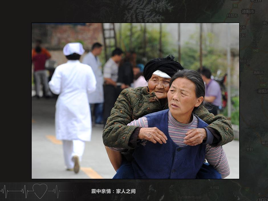 2013年4月21日,雅安市蘆山縣,一名頭發(fā)半百的婦女背著一名老奶奶前來接受治療。