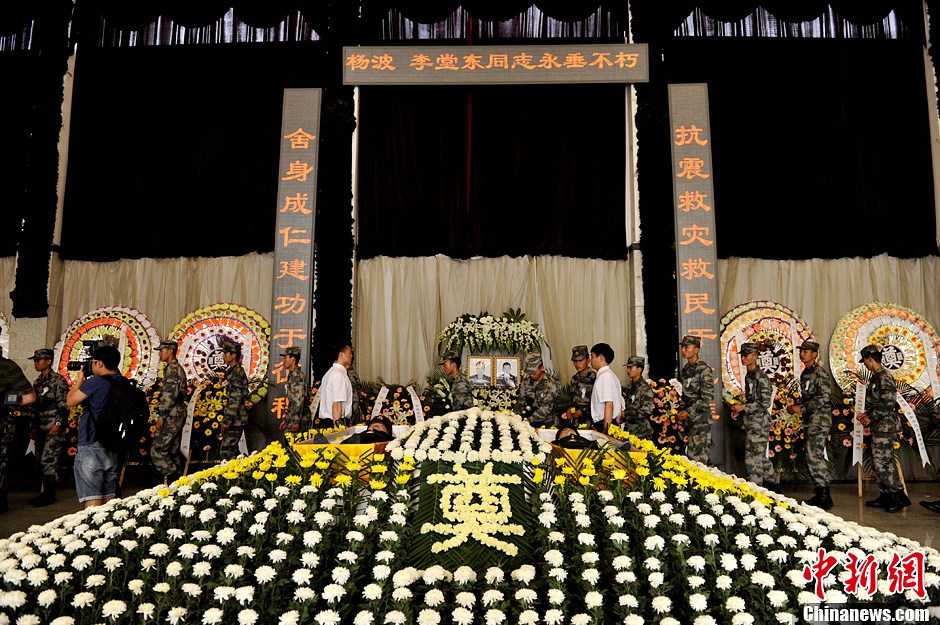 4月26日,“4.20”蘆山地震抗震救災(zāi)犧牲烈士李堂東、楊波遺體告別儀式在四川省眉山市殯儀館舉行。兩位烈士的親屬及身前所在部隊(duì)的戰(zhàn)友參加了送別儀式。圖為告別儀式現(xiàn)場(chǎng)。中新社發(fā) 安源 攝