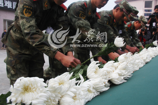 參與救援的戰(zhàn)士為遇難者獻(xiàn)花。大眾網(wǎng)特派記者 攝
