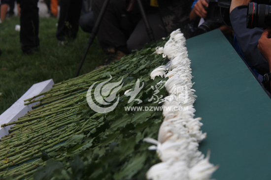 震區(qū)群眾為遇難同胞獻(xiàn)花。大眾網(wǎng)特派記者 攝