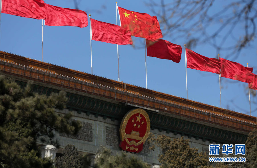 3月5日,十二屆全國人大二次會議在北京人民大會堂開幕。這是人民大會堂樓頂飄揚的紅旗。新華社記者 龐興雷 攝