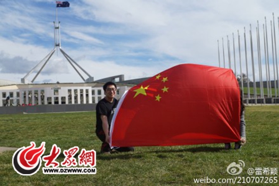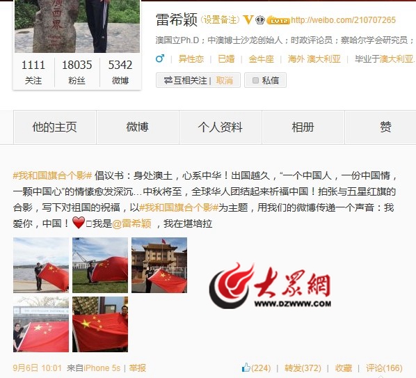 雷希穎:活動是9月6號發(fā)起的,當(dāng)時就是在微博開了一個話題,分享了自己的一些和國旗合影的照片。我到澳大利亞將近4年,微博、微信這些自媒體是我們留學(xué)生關(guān)注國內(nèi)時事最便捷的平臺。在我使用微博、微信的過程中,覺得現(xiàn)在的網(wǎng)絡(luò)輿情有些問題,在網(wǎng)上正常表達(dá)愛國之情反而成了敏感的事,不時地會受到攻擊、辱罵和嘲諷。今年正值建國65周年和抗戰(zhàn)勝利69周年,我想從自身做起,利用這樣的輿論氛圍改變網(wǎng)絡(luò)輿論環(huán)境,讓大家能夠看到一個更加客觀和全面的中國。
