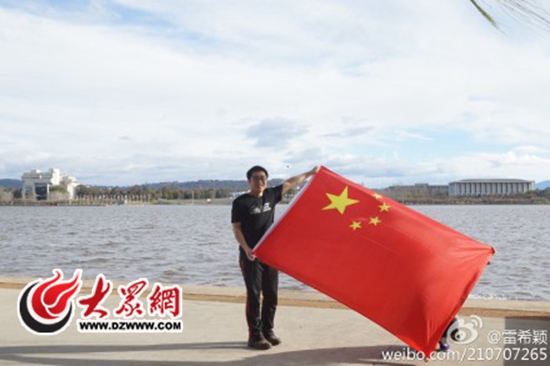 今天是祖國母親的65歲華誕,近段時間來,“我和國旗合個影”活動紅耀微博、微信,成為廣大網(wǎng)友表達(dá)愛國之情、為祖國“慶生”的方式。在短短二十幾天里,該話題的微博閱讀量已經(jīng)超過了2.3億,有近15萬網(wǎng)友參與了話題的討論,大眾網(wǎng)也響應(yīng)發(fā)起了“我和國旗合個影 我為中國來點(diǎn)贊”的活動,得到數(shù)萬山東網(wǎng)民的參與。近日,大眾網(wǎng)通過越洋電話,獨(dú)家采訪了遠(yuǎn)在澳大利亞的該話題的發(fā)起人@雷希穎 ,聽他講述話題發(fā)起背后的故事。