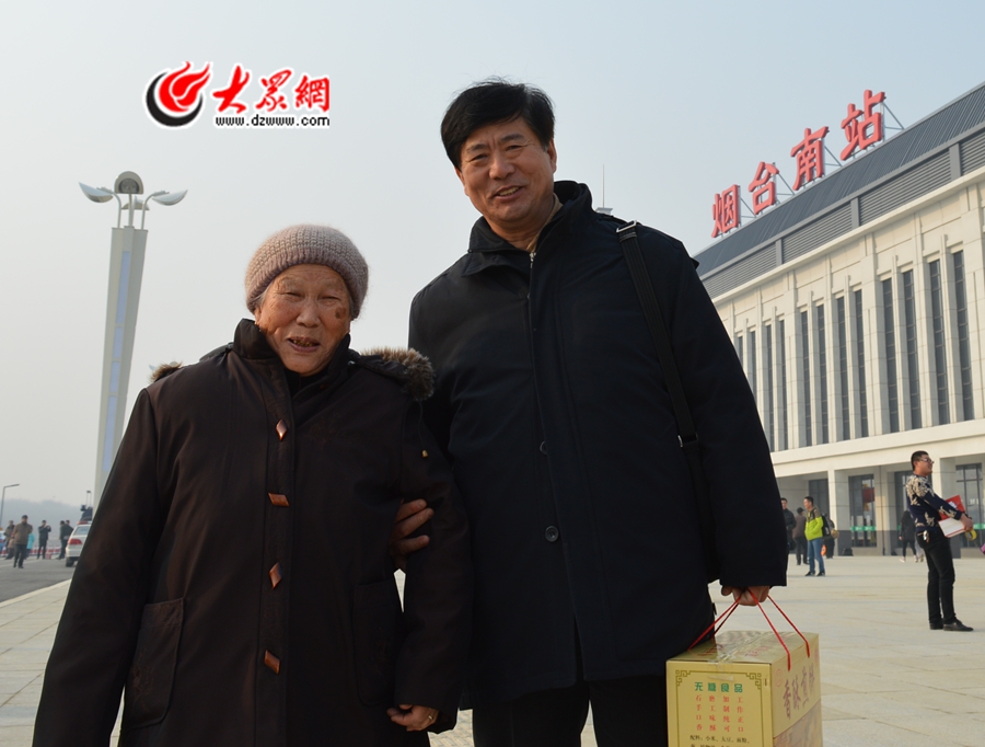 85歲的孫老太,與女婿在煙臺(tái)南站的廣場(chǎng)上留念。從青島有“超快”的火車直達(dá)煙臺(tái),這一刻她等了半個(gè)世紀(jì)。(記者 王宗陽 攝)