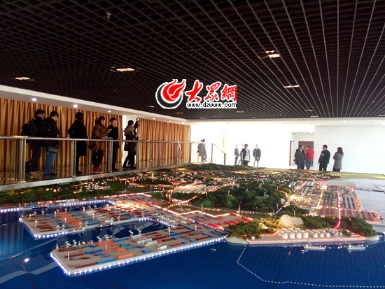 山東鐵路建設(shè)媒體行采訪團(tuán)正在觀摩煙臺港沙盤。(記者 王宗陽 攝)